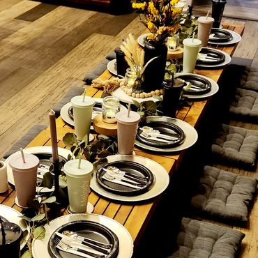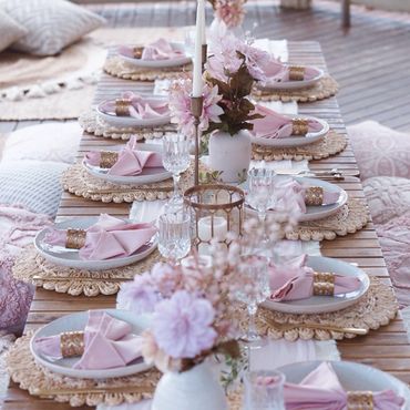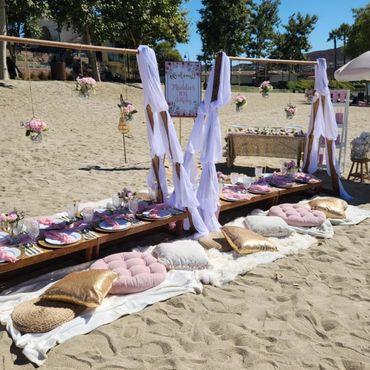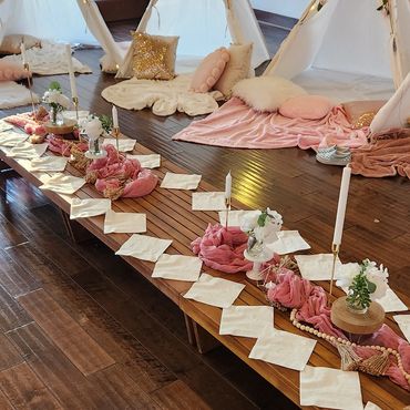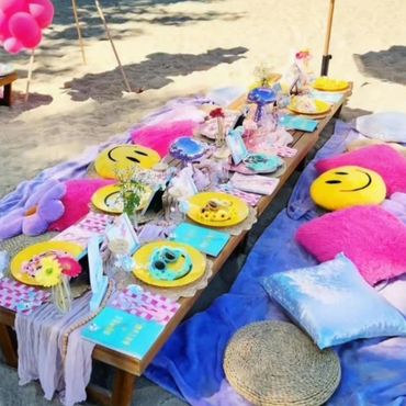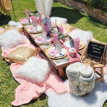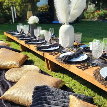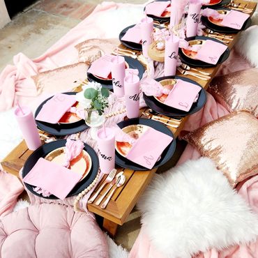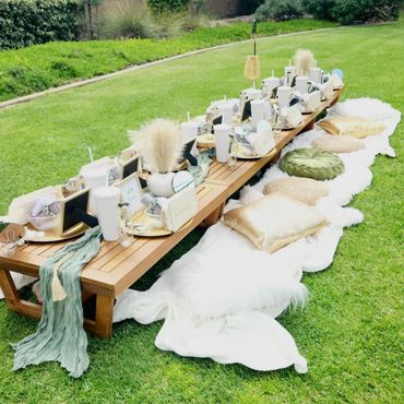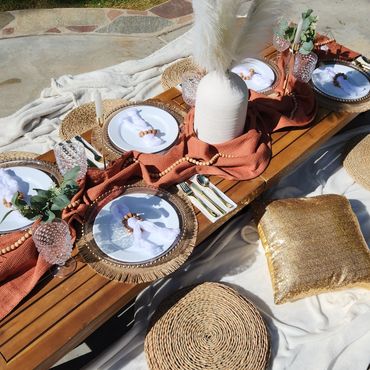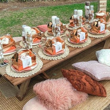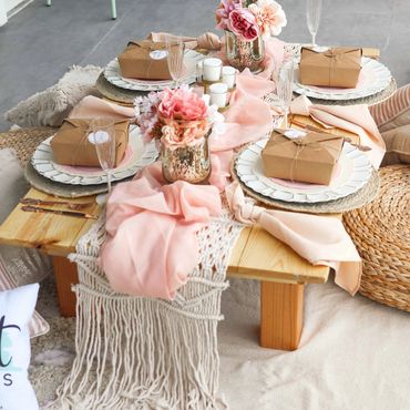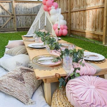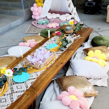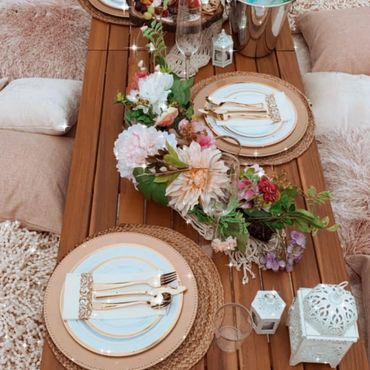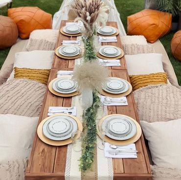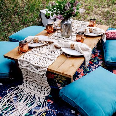 Our Boho Picnics take the hassle and stress out of planning your next event. With our all-inclusive pricing, we deliver to your home, setup, style and pickup. Boho Picnic Tables are great for a casual get together, any birthday party celebration, girls' night, anniversary or an intimate engagement celebration. Includes Wood Boho Table (seats 4), decorative rugs & floor cushions, decorative garland, table decor, fairy lights, lanterns as needed, accent pillows, tableware*, place setting, and drinkware* (included for Picnic).